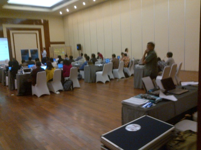 Anda bisa lihat si penerjemah / translator hanya menggunakan alat headset saja yang nirkabel ( wireless headset ) dan headsetnya memiliki mikrofon sehingga si translator dapat langsung menerjemahkan ucapan nara sumber.